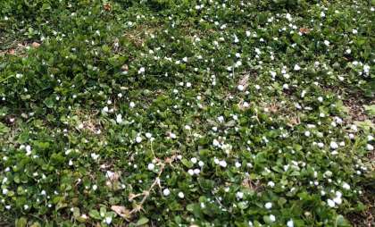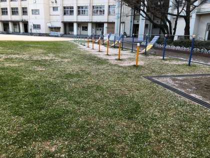朝、出勤してびっくり!緑のはずの芝生が、真っ白です!!目を凝らして見ると、丸くて白い粒々のような雪(霰?)が、うっすらと積もっています。