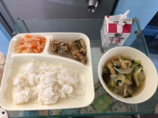 今日の献立は、さばのカレーたつたあげ、五目汁、紅白なます、ごはん、牛乳です。