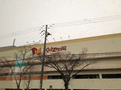 キッザニア甲子園前に到着しました。雪が舞っています。駐車場が開門しました