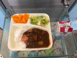 今日の献立は、ハヤシライス、キャベツのバジル風味サラダ、みかん(缶詰)、牛乳です。