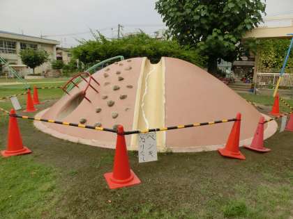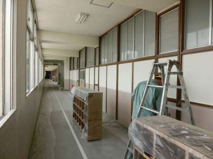 昨年度の本館校舎2階廊下の壁面塗装に続き、今年度は本館3階廊下の壁面を塗装し直しています。また、遊具や学校敷地の外周フェンスの下部などの塗装も行い、お色直しを実施しています。本校職員の管理作業員を中心に、夏季休業中を機会に校内の環境整備に努めています。