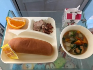 今日の献立は、豚肉のオイスターソース焼き、あつあげと野菜の中華煮、デコポン、コッペパン、アプリコットジャム、牛乳です。