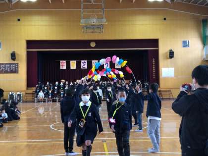 感動の祝う会を終え、花道を通って6年生が退場しました。