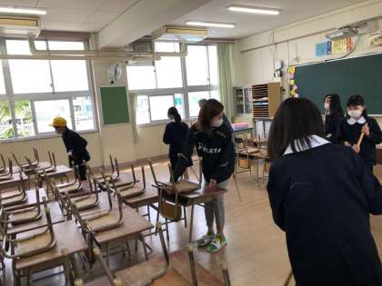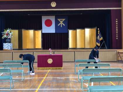 明日はいよいよ入学式です。新 6年生が登校し、入学式準備を行いました。