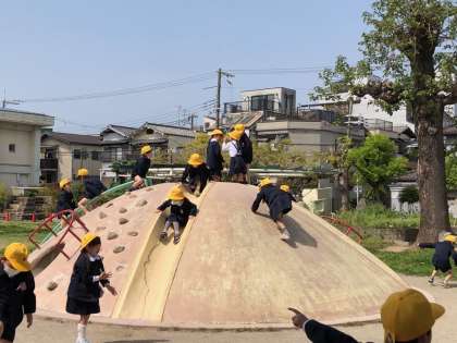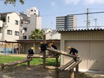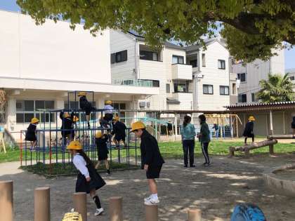 1年生が遊具のつかい方の学習をしています。こども達は大興奮しながらも、教室できいたルールを確かめながら遊んでいます。