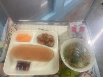 コッペパン、いちごジャム、牛乳、ジャガイモのミートグラタン、レタスのスープ、みかん(缶詰)