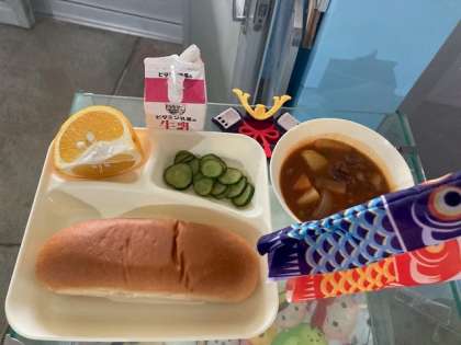 今日の献立 ビーフシチュー、きゅうりのサラダ、あまなつかん、こくとうパン、牛乳