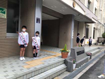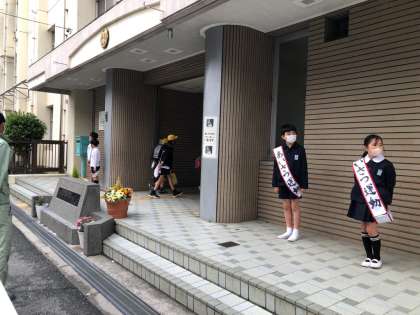 今月の生活目標は「元気よくあいさつをしよう」です。この目標に合わせて、児童会があいさつ運動に取り組んでいます。