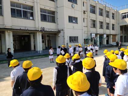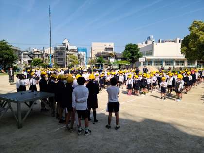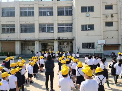 毎月はじめの水曜日は全校朝会です。運動場では今年度初めて行いました。前期の児童会、委員会の代表の紹介がありました。どんな学校にしたいか、それぞれ発表しました。みんなで力を合わせてより良い学校にしていきましょう!