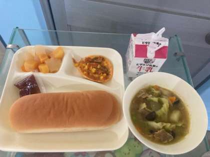 豚肉と野菜のカレースープ煮、変わりピザ、ミックスフルーツ(缶詰)、コッペパン、イチゴジャム、牛乳