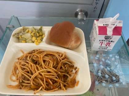 ミートソーススパゲティ、レタスとコーンのサラダ、ミニフィッシュ、1/2こくとうパン、牛乳