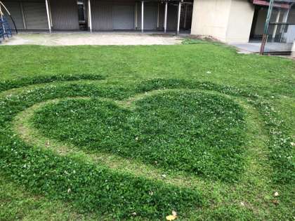 校舎と図書館棟の間の遊具のところです。ハートの模様が素敵ですね。