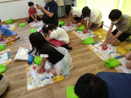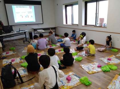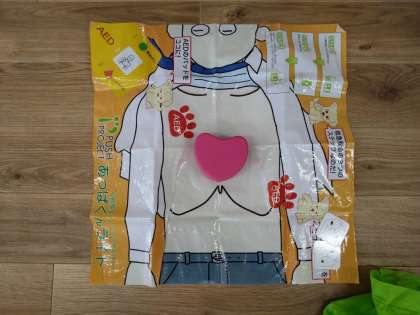 今日の宿題カフェでは、心肺蘇生訓練キットを使った、救急救命の体験が行われていました。ハートの形をした模型をキュッ!と音が鳴るように押すことで、胸骨圧迫の訓練ができます。小さい子どもたちも、一生懸命です。