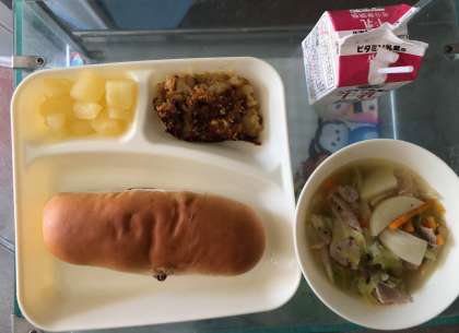 カレードリア、豚肉とキャベツのスープ、りんご缶、レーズンパン、牛乳 です。
