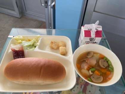 いかてんぷら、フレッシュトマトのスープ煮、キャベツとコーンのソテー、コッペパン、イチゴジャム、牛乳