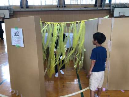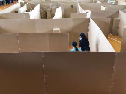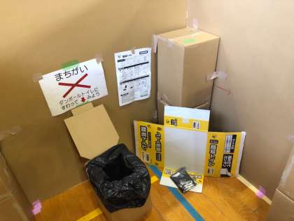 ダンボール避難迷路は地域の方の力作です。クイズに答えて進みます。ハズレの方に進むと、行き止まりにはダンボールトイレが、、、
