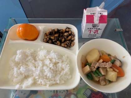 鶏肉と野菜の煮物、ひじき豆、みかん(冷凍牛乳)、ごはん、牛乳