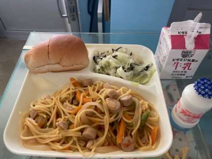 チキントマトスパゲッティ、キャベツのひじきドレッシング、発酵乳、1/2こくとうパン、牛乳