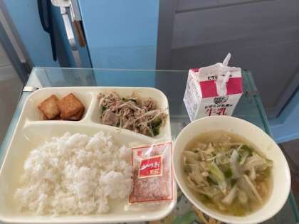 ゴーヤチャンプルー、五目汁、あつあげのしょうがじょうゆかけ、ごはん、牛乳