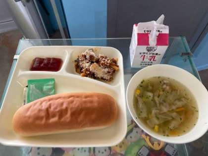 本日の献立 なすのミートグラタン、スープ、ダイスゼリー、コッペパン、りんごジャム、牛乳