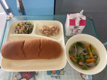 鶏肉のからあげ、とうがんの中華スープ、ツナとチンゲンサイのいためもの、こくとうパン、牛乳