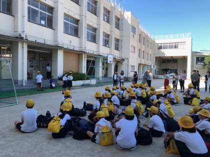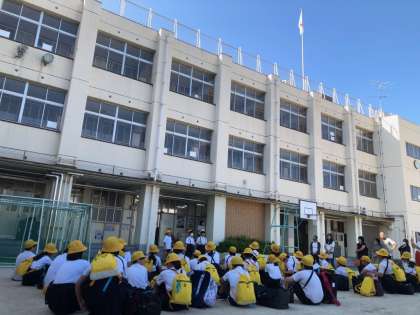 待ちに待った林間学習です。青空の下、出発式を行いました。