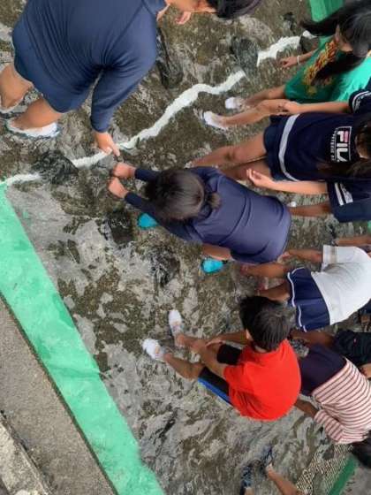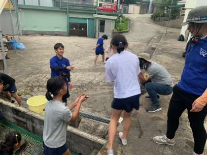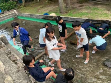 ニジマスをつかまえました。すばやく逃げるニジマスはなかなかつかまりません。