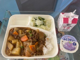 本日の献立 ビーフカレーライス(米粉 使用)、野菜のピクルス、ぶどうゼリー、牛乳