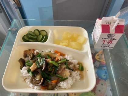 本日の献立 マーボーあつあげ丼、あっさりきゅうり、りんご(缶詰)、牛乳