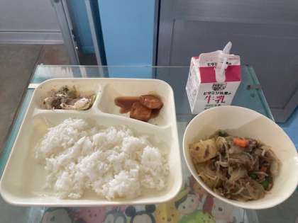 本日の献立 肉じゃが、あつあげのみそだれかけ、キャベツの赤じそあえ、ごはん、牛乳