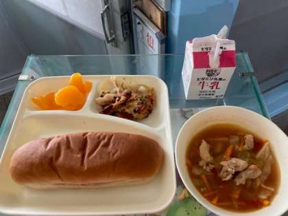本日の献立 豆乳マカロニグラタン(米粉)、トマトスープ、みかん(缶詰)、黒糖パン、牛乳
