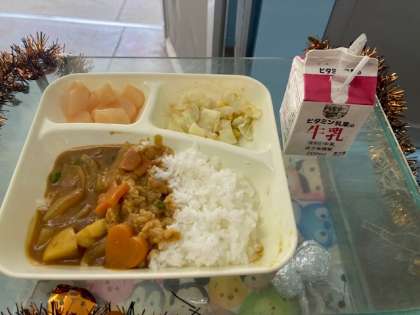 本日の献立 チキンカレーライス(米粉)、キャベツとコーンのサラダ、白桃(缶詰)、牛乳
