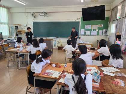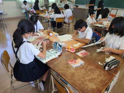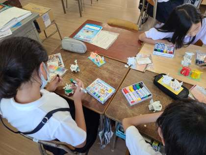 地域の方に来ていただき、5年生がシーサー作りに取り組みました。一枚の紙から作ります。折ったり、穴に通したりしながら形ができました!途中、「大きく口を開けてるのが男の子、閉じているのが女の子」「シーサーは沖縄の言葉で獅子のこと」などのシーサーや沖縄に関する話もしてくださり、とても良い学習になりました!色塗りして完成です!