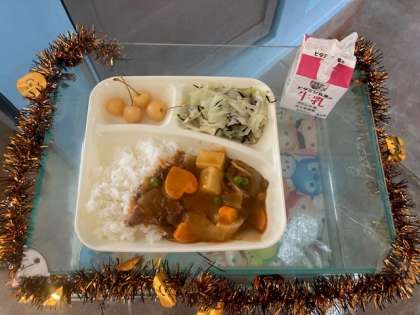 本日の献立 ハヤシライス(米粉使用)、キャベツのひじきドレッシング、さくらんぼ(缶詰)
