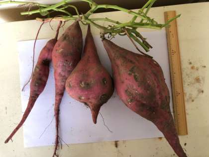 そして下の写真は、管理作業員さんが育ち具合を確かめるために掘り起こしたサツマイモ。大きく育っています。