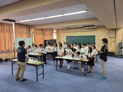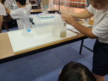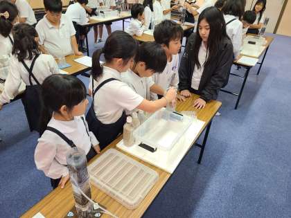 次に水をろ過する実験をしました。説明を聞いて、実験開始。グループにわかれて役割分担してろ過装置を作りました。濁った淀川の水が…なんと透き通った水になりました!さらにそこから、別のろ過装置できれいな水になりました。実験を通して水道についていろいろなことを学びました。