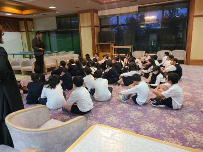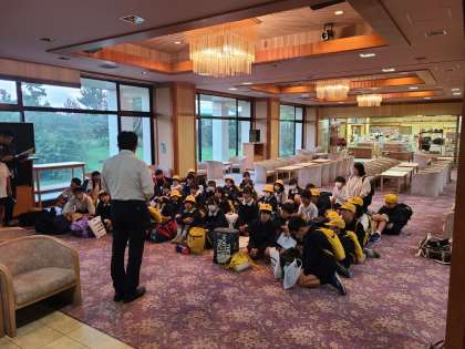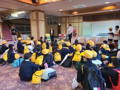 志摩ビーチホテルに到着しました。みんな元気です。開舎式をして、部屋に荷物を置いて、避難訓練をしました。