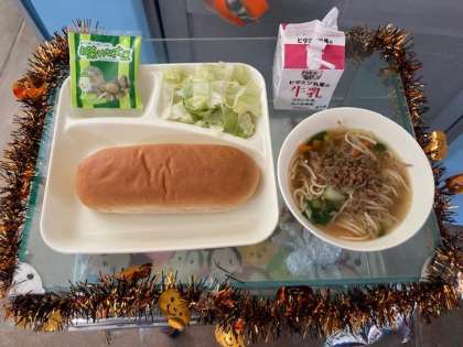 タンタンめん、あっさりキャベツ、まっ茶大豆、こくとうパン、牛乳