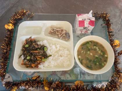 本日の献立 もずくと豚ひき肉のジューシー、さつまいものみそ汁、焼きれんこん、ごはん、牛乳