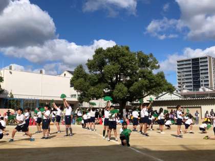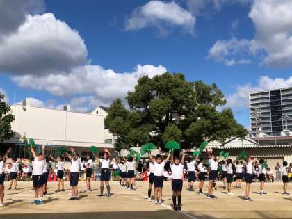4年生の団体演技です。学年テーマカラーのグリーンの扇子の動きは、未来に羽ばたく翼のようです。