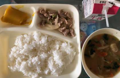 豚肉と野菜の炒めもの、いわしのつみれ汁、かぼちゃういろう、ごはん、牛乳 です。