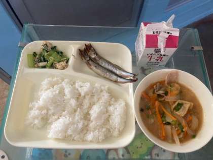 本日の献立 焼きししゃも、みそ汁、こまつなのいためもの、ごはん、牛乳