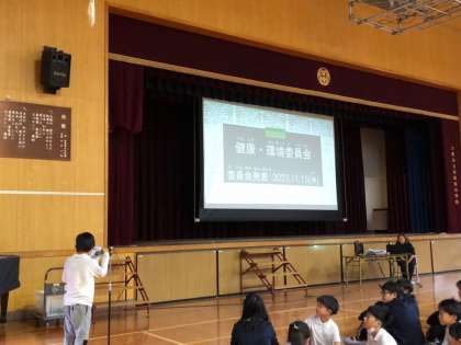 今日の児童集会は、健康環境委員会の発表でした。
