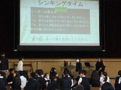 手洗いに関するクイズに、たてわり班で相談して答えます。