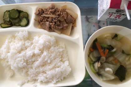 豚肉のコチジャン炒め、鶏肉と春雨のスープ、きゅうりのナムル、ごはん、牛乳 です。