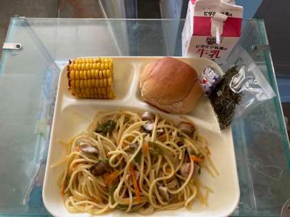 ウインナーときのこの和風スパゲティ、焼きとうもろこし、固形チーズ、1/2こくとうパン、牛乳