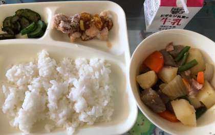あげどりのねぎだれかけ、豚肉とじゃがいもの煮もの、きゅうりの赤じそあえ、ごはん、牛乳 です。