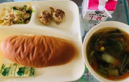 焼きしゅうまい、中華みそスープ、ツナと野菜のオイスターソース炒め、コッペパン、ソフトマーガリン、牛乳 です。