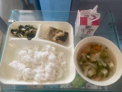 さばのみぞれかけ、すまし汁、こまつなの煮びたし、ごはん、牛乳