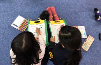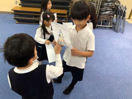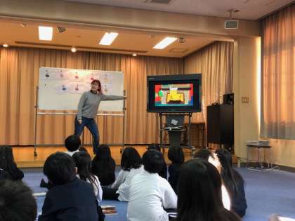 1年生と2年生が、C-netの先生と英語の活動を楽しみました。クリスマスツリーの飾りに思い思いの色をつけ、ノリノリで活動しながら、色の英語表現をたくさん覚えました。